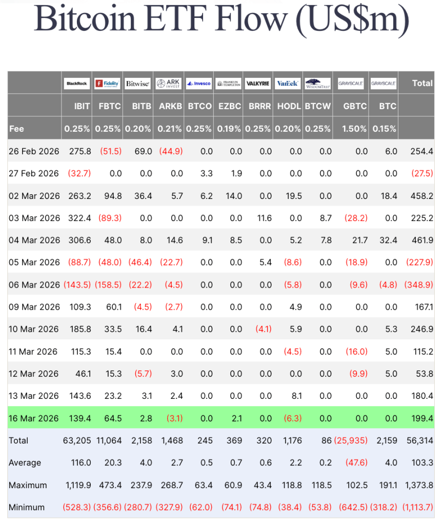 The best proof for this lies in ETFs. Farside data shows that spot Bitcoin ETFs saw $199.4 million in inflows on March 16, marking the sixth consecutive day of inflows after two days of heavy redemptions.